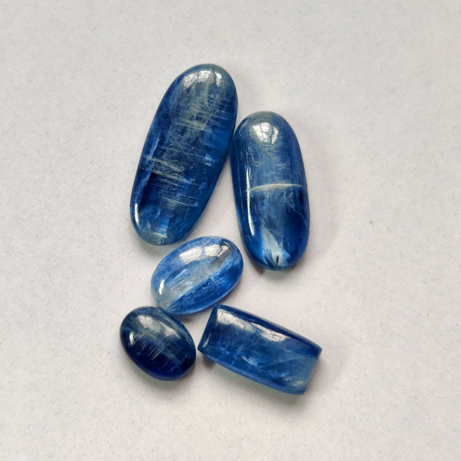Discover the enchanting beauty of Natural Blue Kyanite Gemstone, an exquisitely crafted collection perfect for your jewelry needs. Each piece, handmade with utmost precision, comes in unique oval and rectangular shapes weighing a total of 39.00 carats. With stone sizes ranging from 25X10X3 to 10X7X3 MM, these cabochon gems boast an untreated, natural allure. Item code 17986 guarantees no lab-created substitutes, presenting a genuine, high-quality beauty you can trust. As wholesalers and manufacturers of natural precious semi-precious stones, Kazim Gems ensures you receive only the best in craftsmanship and authenticity with this set of five beautiful pieces.