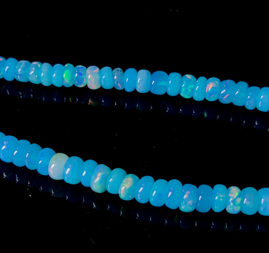 Discover the captivating beauty of our Natural Ethiopian Opal Beaded Necklace, a dazzling piece that showcases the exotic allure of Welo Fire opals. This exquisite necklace features vibrant blue opal beads, meticulously cut into rondelle shapes, ranging in size from 4X2 to 3X1 mm. Weighing an impressive 43.00 carats, this cabochon, non-faceted gemstone piece is of good natural quality and enhanced in color to bring out its fiery brilliance. Item Code K17523, crafted by Kazim Gems, assures authenticity with its untreated, lab-created free nature. Please note, images are captured under daylight lamps, creating potential slight variances in real-life appearance.