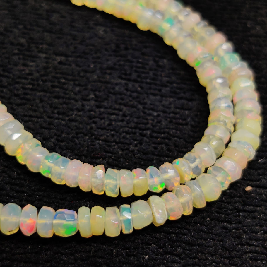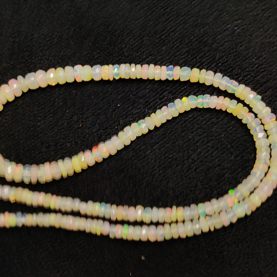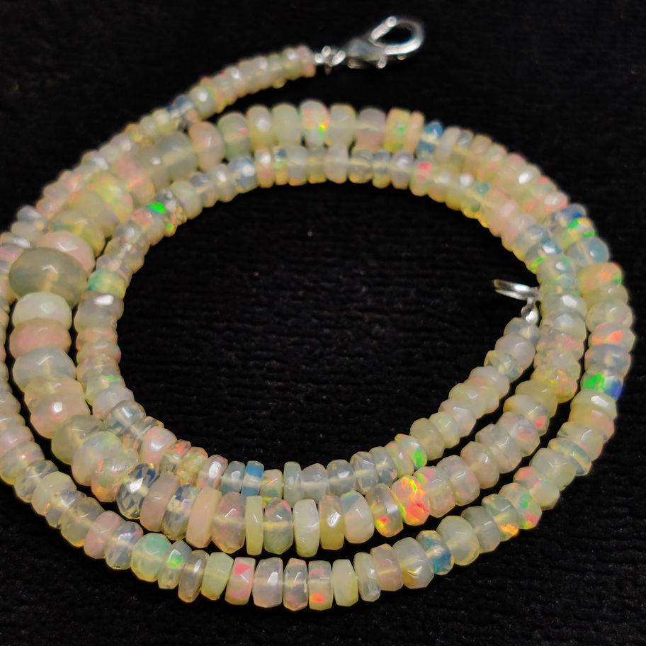 Discover timeless elegance with our Natural Ethiopian Opal Necklace Gemstone, featuring exquisite 42.00 carat faceted rondelle-shaped opals. This 17.00-inch handmade masterpiece showcases opals sized from 7x3 to 3x1 mm, ensuring a perfect blend of subtlety and sparkle with every movement. Committed to quality, Kazim Gems offers this stunning necklace made from 100% natural opals, providing an authentic touch that's lab-created free. Item code 16356 is perfect for those who appreciate fine craftsmanship and unique beauty. As wholesalers and manufacturers, we at Kazim Gems are dedicated to bringing you exceptional gemstone jewelry that stands out.