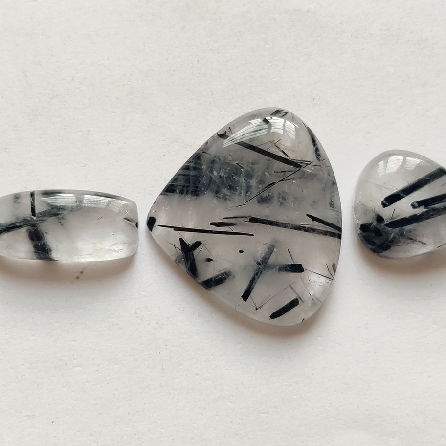 Discover the captivating allure of our Natural Black Rutile Quartz Gemstone Loose Cabochon, exclusively available at Kazim Gems. This unique gemstone, named RUTILE, comes in an elegant pear shape, weighing an impressive 112.00 carats and available in sizes 34X40X6MM and 26X12X5MM. Handcrafted with meticulous attention to detail, these cabochons are of good quality and are perfect for creating stunning bespoke jewelry. Item code 17431 includes 3 handmade natural pieces, free from lab creation and unfaceted for a raw, organic beauty. At Kazim Gems, we take pride in being wholesalers and manufacturer suppliers of natural precious and semi-precious gemstones, dedicated to offering unparalleled value and authenticity.