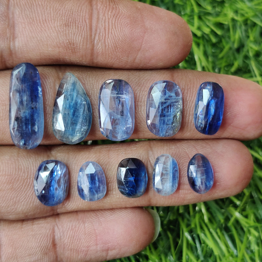 Discover the captivating allure of our Natural Blue Kyanite Gemstone, faceted to perfection for a brilliant display. Each piece in this collection boasts a fancy shape and is polished, showcasing the gemstone's natural beauty and vivid blue hue. The set includes 10 pieces, each sized between 20X8X3MM and 9X7X2MM, with a total weight of 33.00 carats. Item Code: 15895, these gemstones exhibit good natural quality, ideal for bespoke jewelry creation. At Kazim Gems, we pride ourselves as wholesalers and manufacturers of high-quality natural precious and semi-precious gems, ensuring you receive superior products every time.