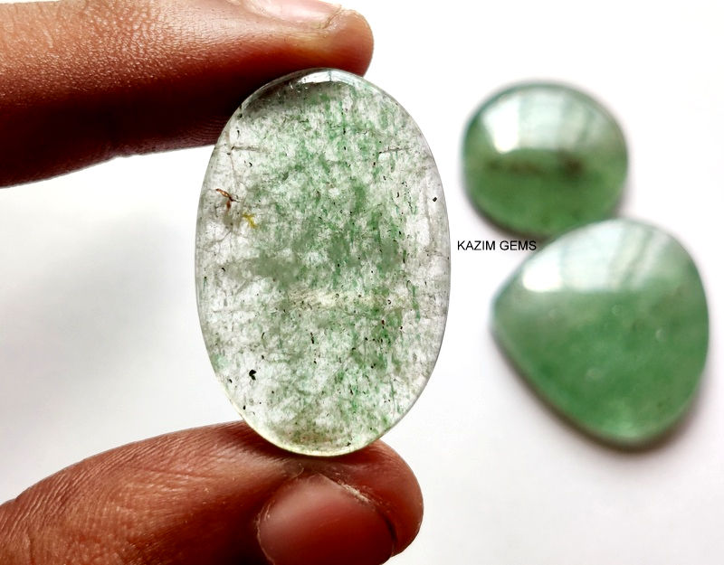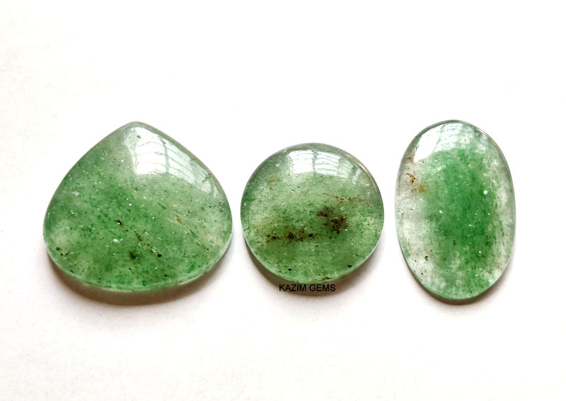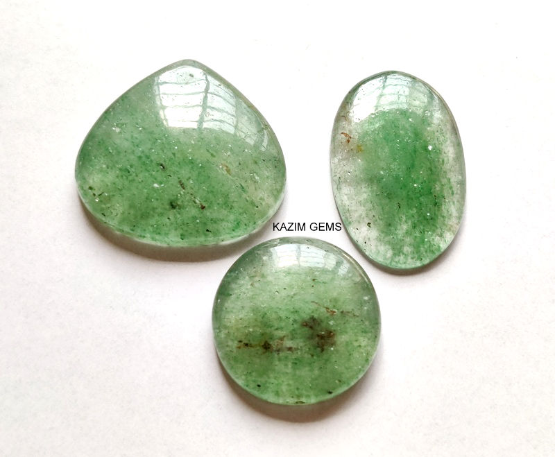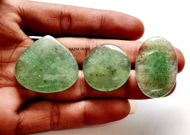 Discover the unique beauty of our Natural Green Aventurine Superb Top Grade Quality Cabochon Loose Gemstone, exclusively available at Kazim Gems. Measuring at sizes 32X34X7MM, 34X22X4MM, and offered in pear, oval, and round shapes, this stunning set weighs a total of 132Ct. Each of the three pieces is meticulously polished, showcasing the good natural quality of aventurine. Ideal for your jewelry projects, the cabochon cut enhances the stone's natural allure, making it a perfect addition to your collection. At Kazim Gems, we are wholesalers and manufacturers dedicated to providing exceptional precious and semi-precious gemstones to our valued customers.