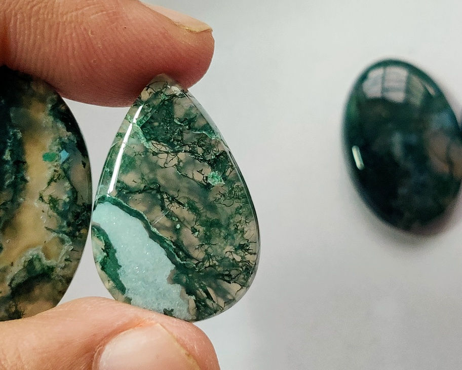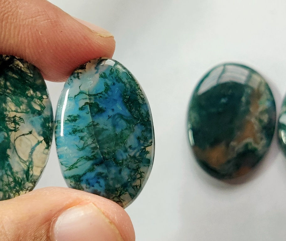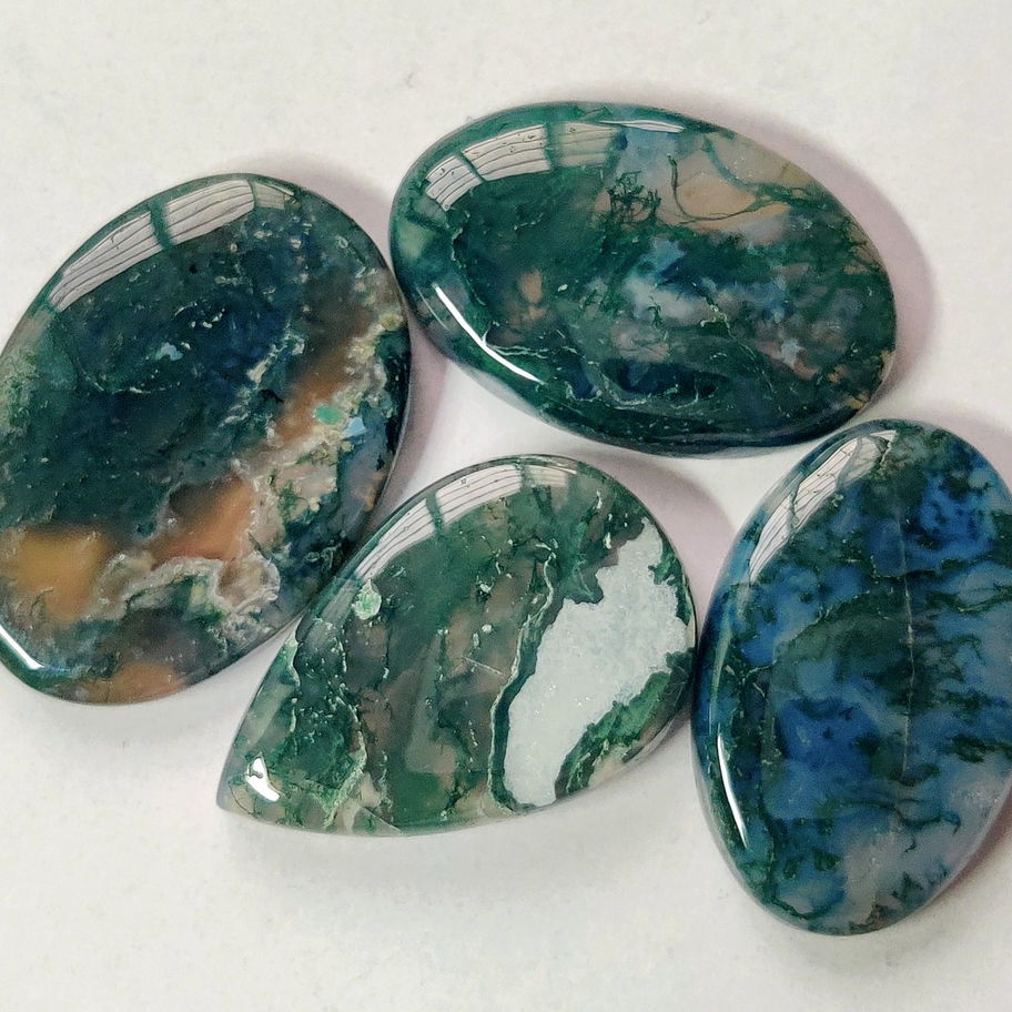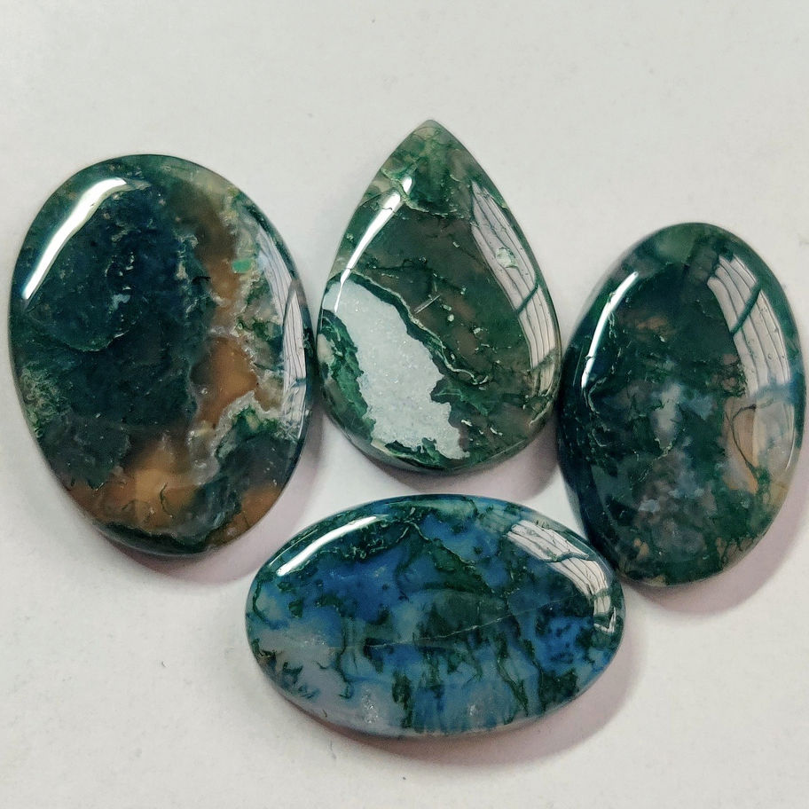 Discover the exquisite beauty of our NATURAL MOSS AGATE GEMSTONE collection, exclusively available on Kazim Gems. Featuring four high-quality, handmade cabochons (Item Codes: 16129, 16131) in elegant oval and pear shapes, each piece boasts a substantial 107-carat weight and comes in sizes ranging from 31x22x4 MM to 28x19x5 MM. These stones are 100% natural, not lab-created, making them a unique addition to any jewelry collection. As wholesalers and manufacturer suppliers of natural precious gemstones, we ensure each piece is meticulously crafted to offer superb quality and authentic charm. Elevate your jewelry creations with these stunning Moss Agate gemstones today.