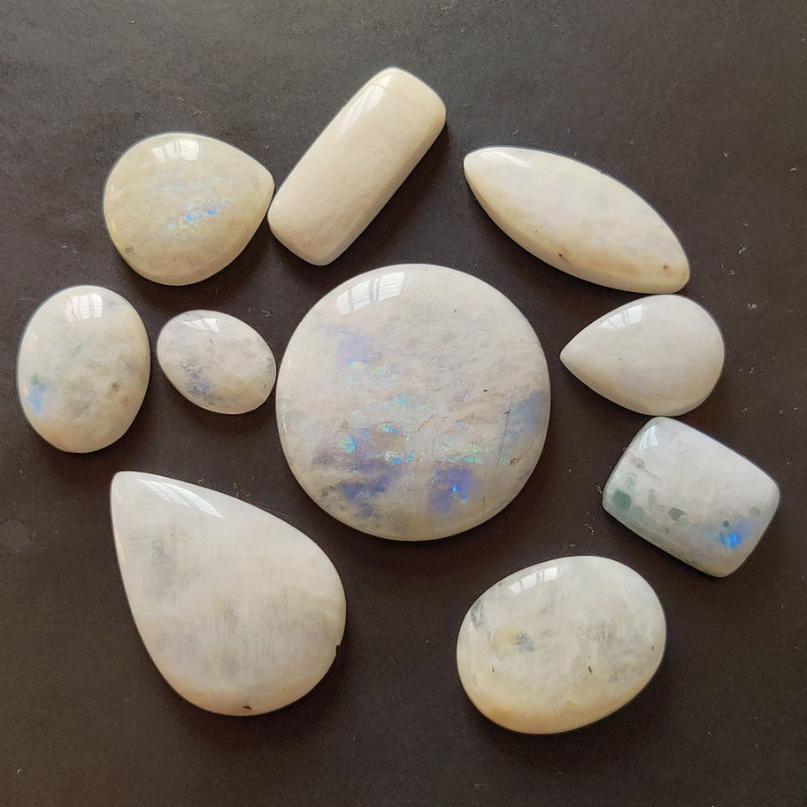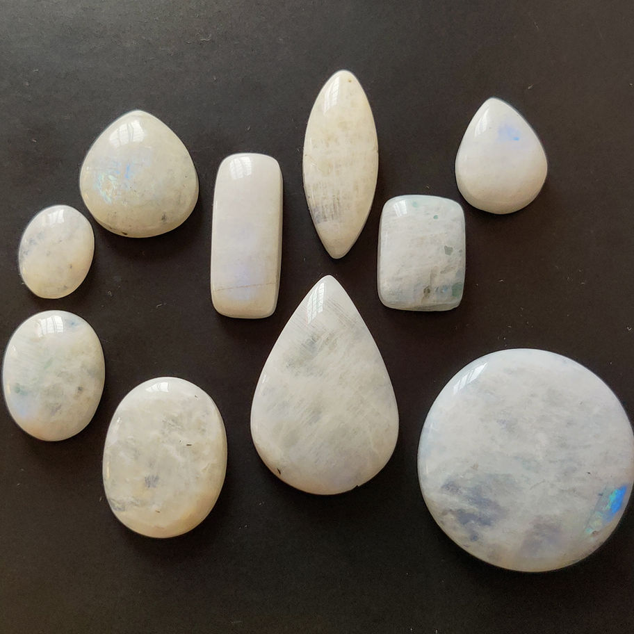 Discover the enchanting allure of our Natural Rainbow Moonstone, featuring 10 high-quality, polished cabochons perfect for your bespoke jewelry creations. Each piece ranges in size from 32x33x7mm to 15x11x4mm, and comes in a variety of shapes including oval, pear, round, and square. With a total weight of 268Ct and item codes 15883/15871, these good natural stones ensure stunning craftsmanship. As wholesalers and manufacturers, Kazim Gems promises unparalleled quality and value for all your jewelry-making needs. Enhance your collection today with our top-quality Rainbow Moonstones.