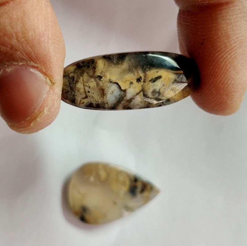 Experience the captivating allure of our Natural Tiger Dendrite Gemstone Agate Cabochons, meticulously crafted to enhance your jewelry collection. Each piece, polished to perfection, features an exquisite oval and pear shape with dimensions of 30x11x5mm and 26x18x4mm, respectively. This 34-carat duo (Item Code: 17183) boasts the intrinsic beauty of good natural quality, unfaceted yet flawlessly cabochon cut. At Kazim Gems, we are proud wholesalers and manufacturer suppliers of both natural precious and semi-precious gemstones, committed to delivering exceptional quality and aesthetic brilliance. Elevate your creations with these unique and naturally stunning Tiger Dendrite stones.
