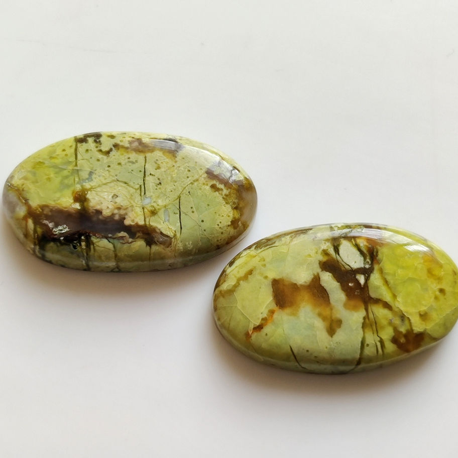 Discover the brilliance of our Natural Yellow Opal Gemstones, perfect for crafting exquisite pendants. Each opal measures 33x18x6mm and 32x19x5mm, shaped to perfection in an elegant oval cabochon, and weighs a combined total of 56 carats. These good quality, natural stones (ITAM CODE 16206) are ready to be transformed into stunning pieces of jewelry. Enjoy the benefit of dealing with Kazim Gems, a trusted wholesaler and manufacturer supplier of natural precious and semi-precious gemstones. We cater to your bespoke needs, offering stones crafted to your specific demands.