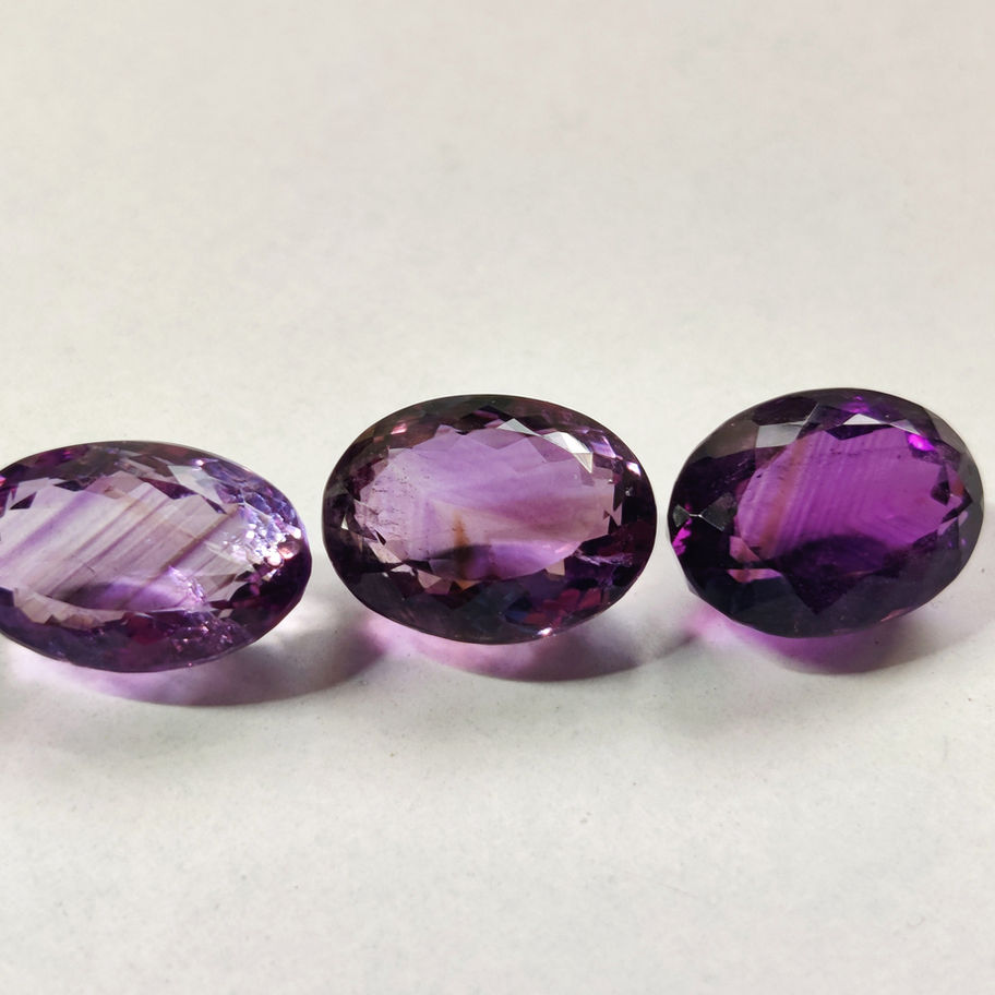 Experience the elegance of our Purple Amethyst Gemstone Lot, featuring three faceted, oval-shaped stones, each sized at 17x11x9mm or 16x12x9mm. Weighing a total of 40.00ct, these good natural quality gemstones (Item Code: 17863.2) make a stunning addition to any collection. At Kazim Gems, we pride ourselves on being wholesalers and manufacturers of natural precious and semi-precious gemstones, also catering to custom demands. Enhance your jewelry creations with these exquisite amethysts, perfect for any bespoke design.