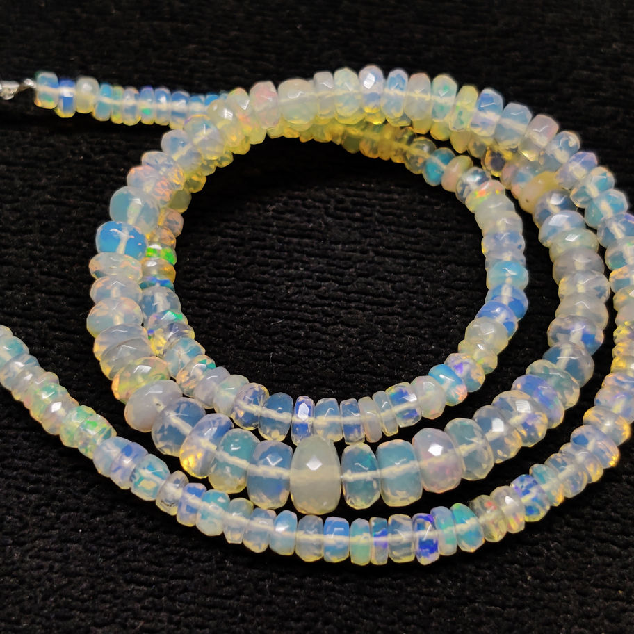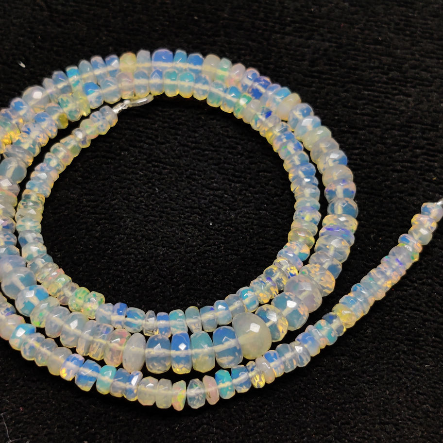 Discover unparalleled elegance with our NATURAL ETHIOPIAN OPAL NECKLACE GEMSTONE, crafted with 55.00 carats of high-quality Welo Fire Opal. Each gemstone in this 19.00-inch necklace is faceted and shaped in a stunning rondelle, ranging in size from 7x4 to 3x1 mm, promising a mesmerizing play of colors. Handcrafted with 100% natural opals, this one-line strand necklace ensures no two pieces are alike, offering a unique charm to its wearer. As direct wholesalers and manufacturer suppliers, Kazim Gems guarantees the authenticity and superior quality of our gemstones. Item Code: 16352 - bring home the brilliance of Ethiopian opal today.